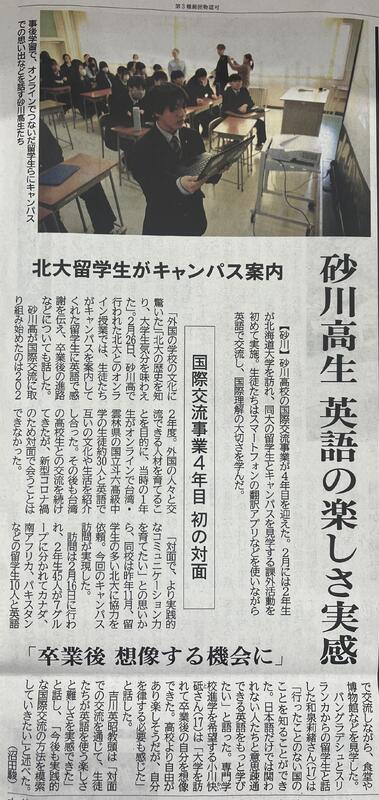 2026 年2月16 日(月) に、本校2年次45名が、国際理解教育の一環として、砂川市の支援を受けて国際交流事業「英語でつながる北大体験!留学生との交流&キャンパスツアー」と題し、北海道大学に行き、北海道大学の留学生と交流をはかりながら、キャンパスをめぐりました。以下、2026年3月6日(金)北海道新聞の記事に掲載されました。